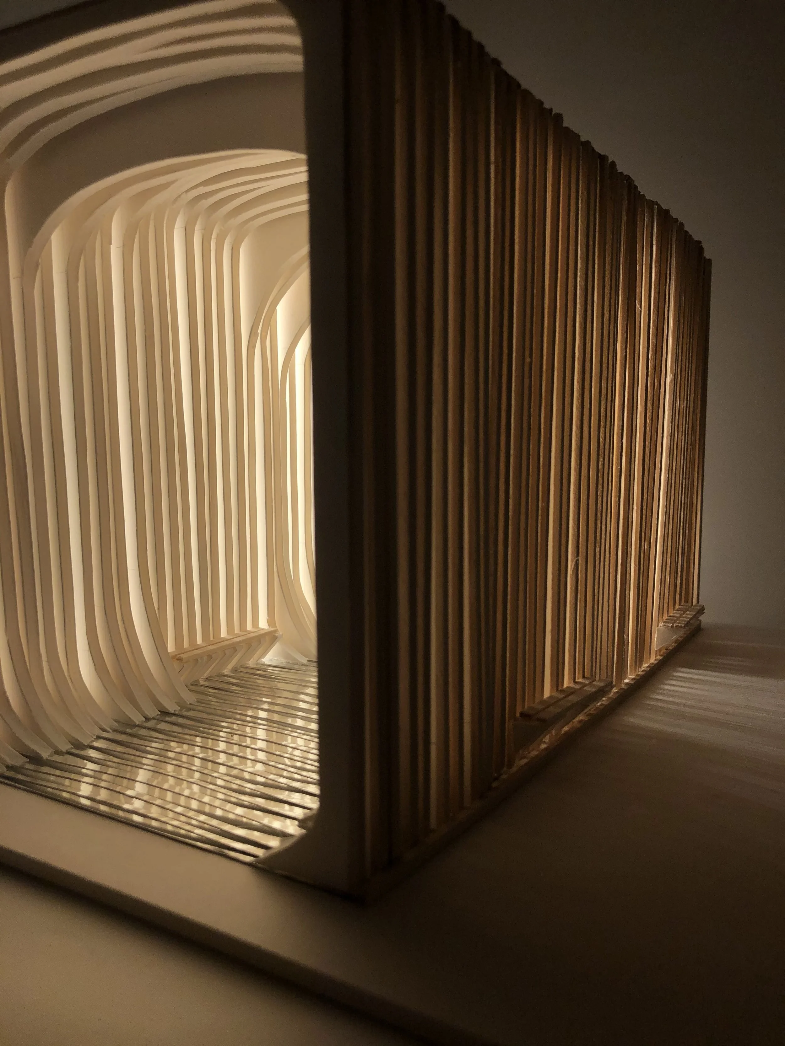 A mimicry and 3-dimensional experience of a sound. This folly is designed to heighten the user’s senses while listening to the song “AND U,” by the artist Hosini. The song is specifically designed to be interpreted by listeners on their own. In response to the artist’s intent, rather than literally representing the song through design, I analyzed the sound waves of the song to create key experiences for the user.